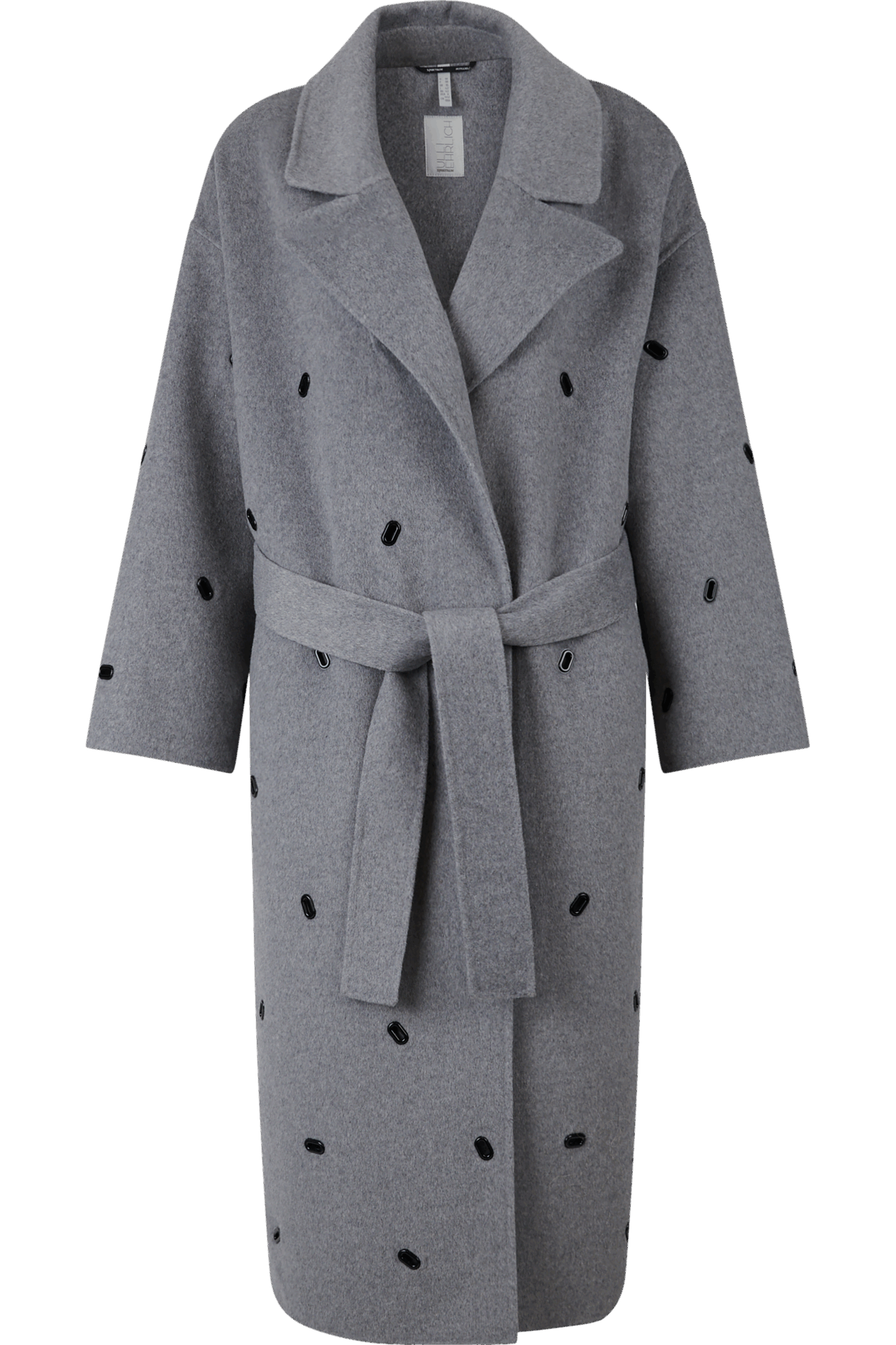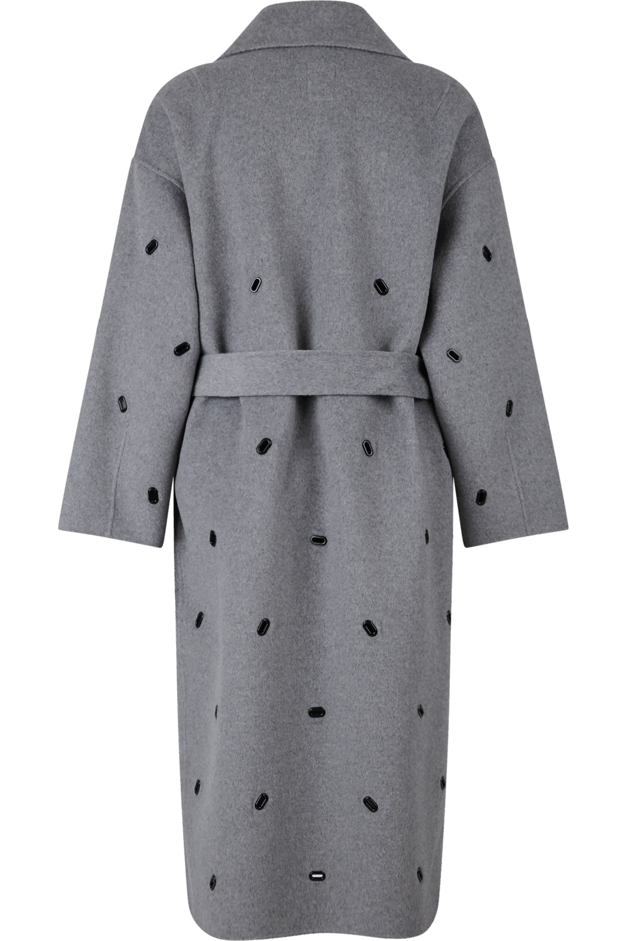 Extravaganter und aufregender Wollmantel mit unregelmäßig angeordneten, ovalen Ösen, die von Saum bis Taille ein auffälliges Design schaffen. Der Gürtel in der Taille betont die feminine Silhouette.